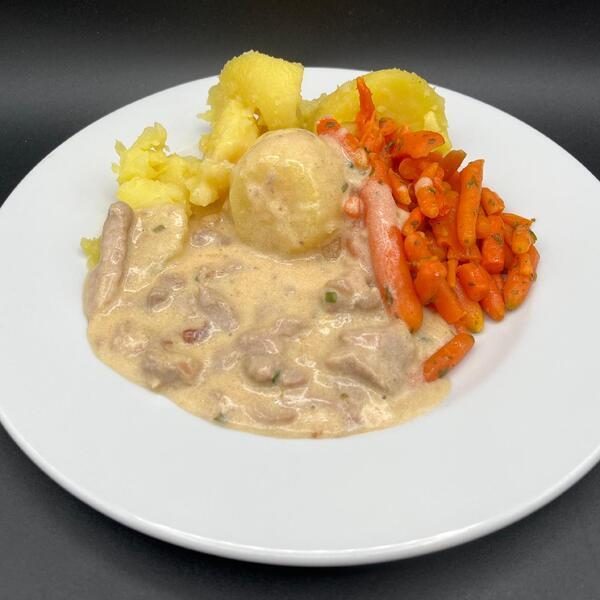 Schweinegeschnetzeltes mit Möhren und Salzkartoffeln