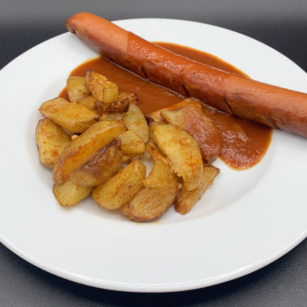 Currywurst mit Curry-Dip und Pikanten Kartoffelspalten