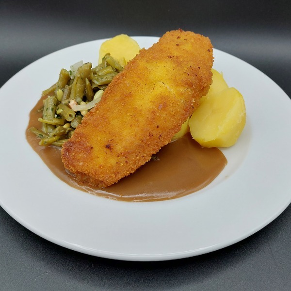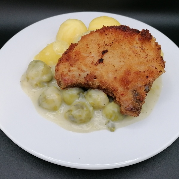 Paniertes Kasslerkotelette mit Rosenkohlgemüse und Salzkartoffeln