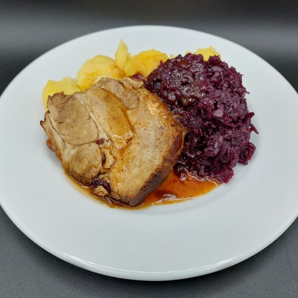 Saftiger Schweinebraten mit Rotkohl und Salzkartoffeln
