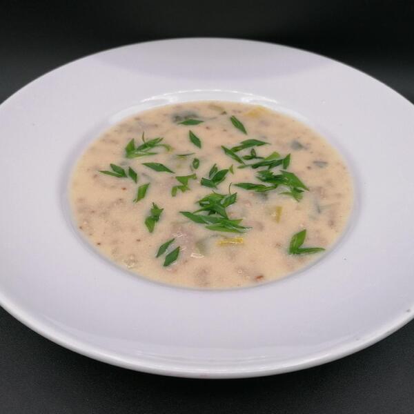 Käse-Lauch-Suppe mit Hackfleisch und Brötchen