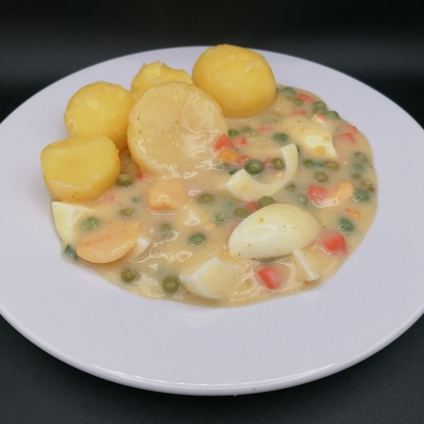Buntes Eierfrikassee mit Salzkartoffeln