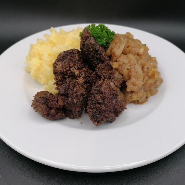 Geflügel-Leber mit geschmorte Apfel-Zwiebeln und Kartoffel-Stampf