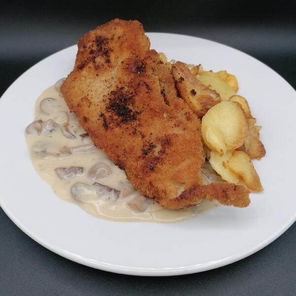 Paniertes Schnitzel mit Rahmchampignons und Bratkartoffeln