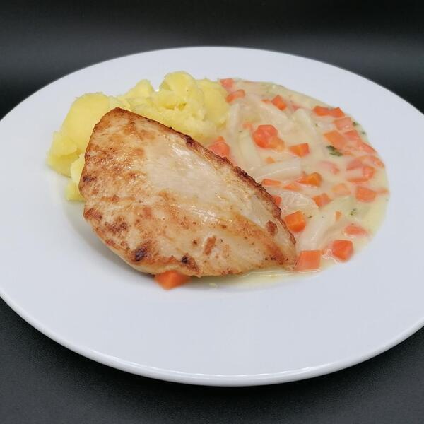 Gebratene Hähnchenbrust mit Möhren-Kohlrabi-Gemüse und Salzkartoffeln