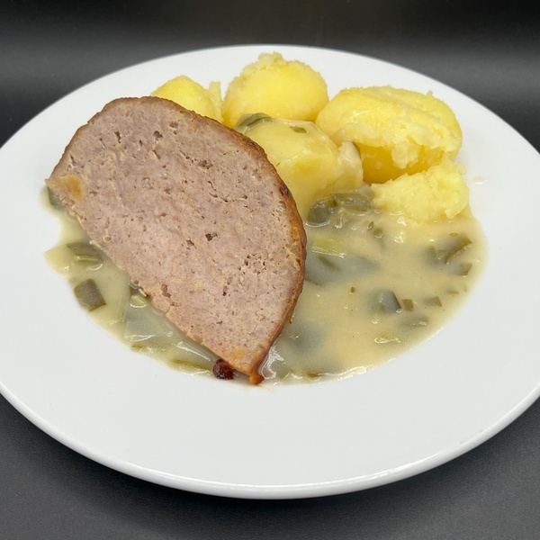 Hackbraten mit Poree-Rahmgemüse und Salzkartoffeln