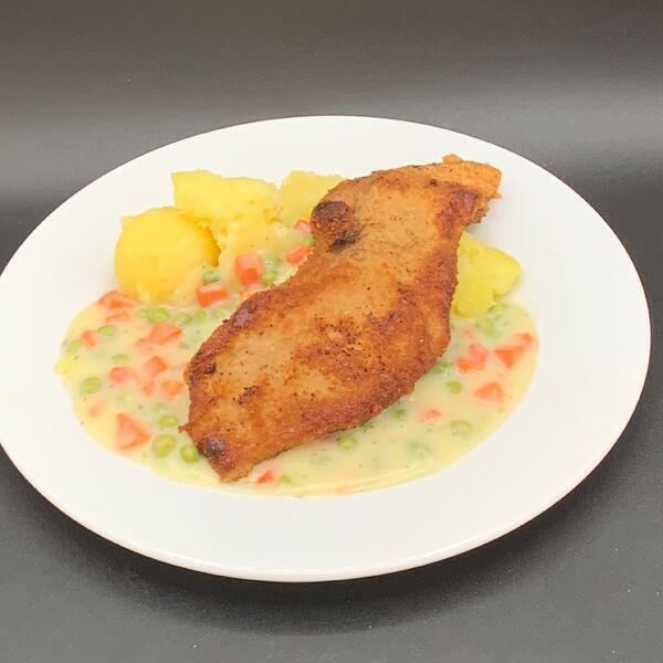 Schnitzel mit Mischgemüse zum Überfüllen und Salzkartoffeln